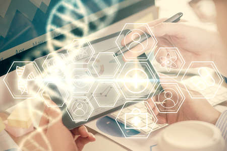Double exposure of woman hands typing on computer and DNA hologram drawing. Medical education concept.
