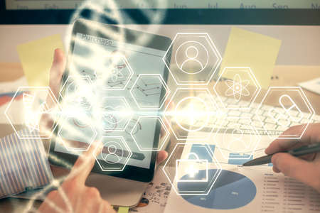 Double exposure of creative DNA hologram and hand writing in notebook on background with laptop. Bio Engineering and DNA Research concept