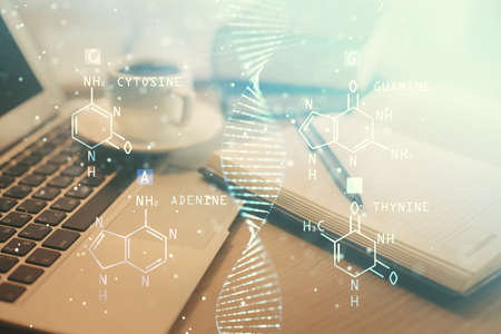 Double exposure of DNA drawing and desktop with coffee and items on table background. Concept of medical science education