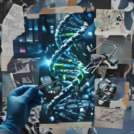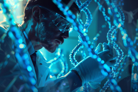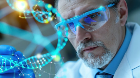 A focused scientist in a laboratory examines a DNA helix with high-tech visual elements, showcasing the intersection of biology and cutting-edge technology.