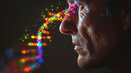 A thoughtful human face with intricate molecular structures gently overlaying the skin representing the complexities of gene therapy at a cellular level..