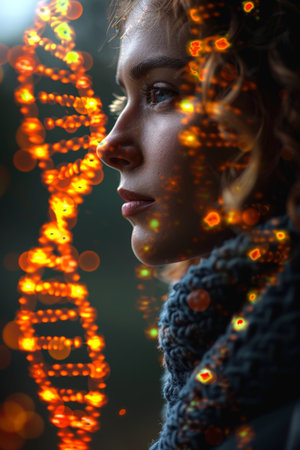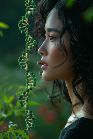 Abstract portrait of a woman surrounded by dna chains exploring biotechnology and medical science