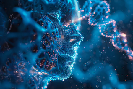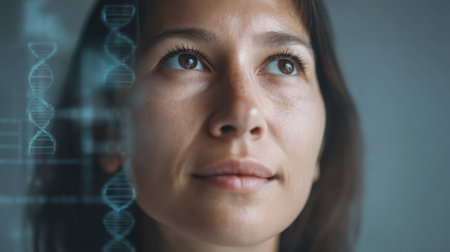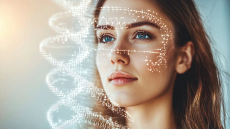 This captivating portrait features a woman with a serene expression, surrounded by futuristic DNA patterns and glowing lines, symbolizing the fusion of beauty and science.