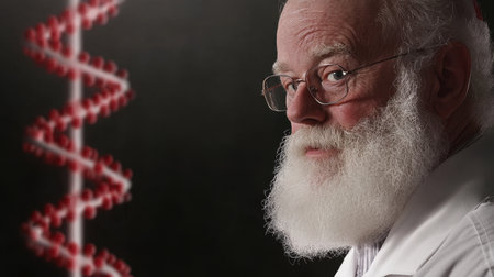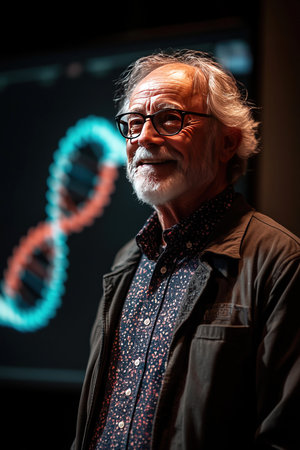 A senior scientist studies DNA double helix models in the lab highlighting their expertise and curiosity in genetics.