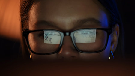 A researcher looks intently at an augmented reality screen displaying important data and visuals about her work. The setting is a modern laboratory filled with technology.