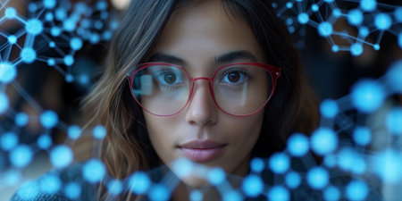 Close-up of a thoughtful young woman wearing red glasses, her gaze piercing through a digital network of nodes symbolizing innovation, technology, and connection.