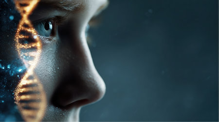 A close profile shows a person's face and eye looking toward the right, with a glowing double helix dna strand overlaid on the face. The background is a blurred blue.