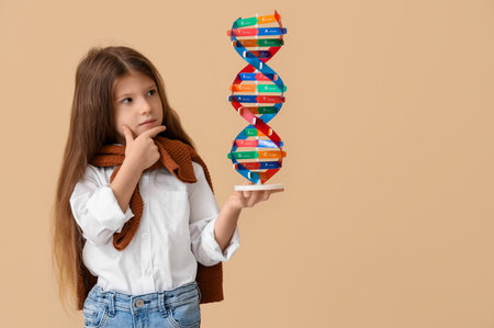 Thoughtful little scientist with DNA model on beige background. Opposite Day celebration