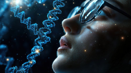 A person's face is shown with a DNA strand in the background. Concept of curiosity and wonder about the mysteries of genetics and the human body
