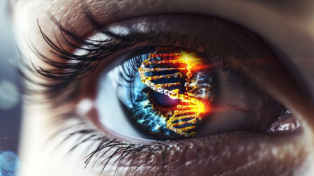 macro female eye with reflection of DNA spiral with orange glow, concept science week. High