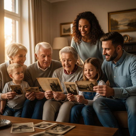 A candid, cinematic image of a multi-generational family sharing intimate stories while examining ol