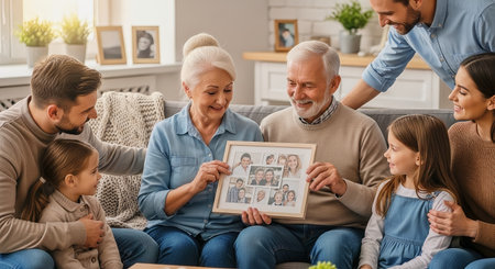 Grandparents and grandchildren sit in a warm sunlit living room admiring a framed family photo collage. This candid home scene conveys togetherness and nostalgia for lifestyle and advertising use.