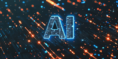 Modern technology logo with stylized AI letters formed from connected nodes and circuit traces, floating over clean backdrop