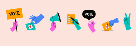 Vote, election concept design with hand drawn hands holding Vote sign, leaving vote, participate in voting, holding a megaphone, hand leaving paper in ballot box. Modern minimal style. Poster, banner and social media post templates