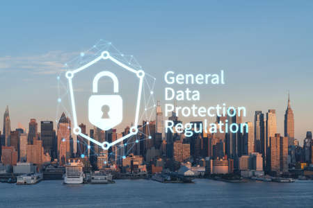 New York City skyline from New Jersey over Hudson River, Midtown Manhattan skyscrapers at sunset, USA. GDPR hologram, concept of data protection, regulation and privacy for all individuals