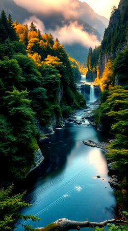 Autumn landscape with colorful forest and waterfall. Colorful autumn forest and waterfall