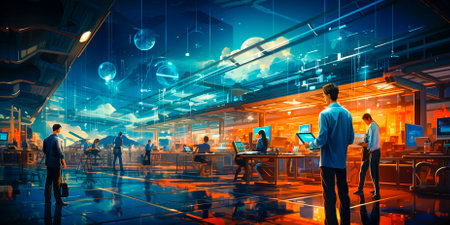 Technology showing woman engaged with advanced digital holographic display showing complex data...