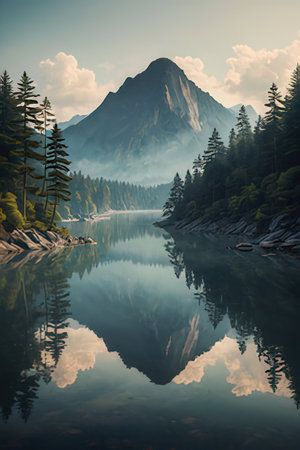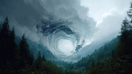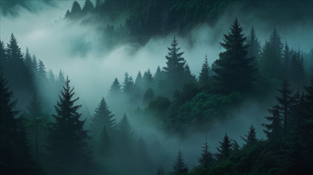 Misty landscape with a fir forest in a hipster vintage retro style. Ideal for adding a nostalgic, atmospheric touch to your designs, perfect for print, digital projects, and aesthetic visual content.