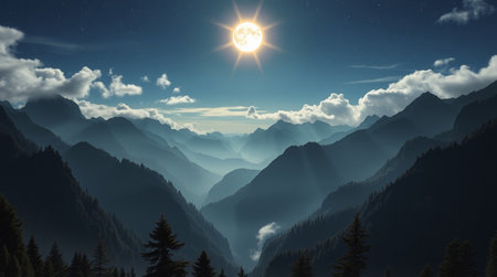 Mountain landscape with moon and clouds in the sky. 3d rendering