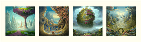 A surreal landscape with abstract trees clouds melting islands off ground. Vector illustration,