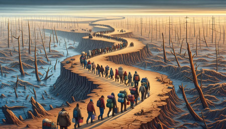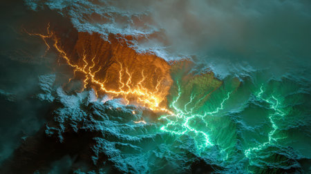 A fierce tempest brews overhead as jagged flashes cut through thick, roiling clouds, creating a powerful contrast between darkness and intense illumination.