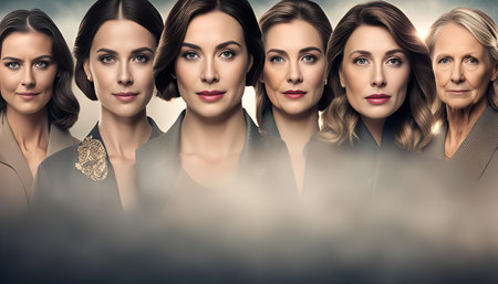 A studio portrait of six women of different ages, each with their own unique beauty and expression.