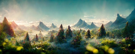 Magical forest with dense vegetation, green trees and bright flowers in the predawn mist