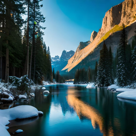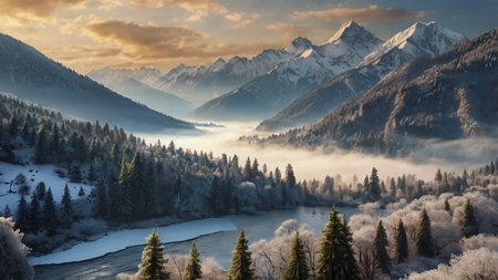 Foggy winter morning in the mountains. Mountain landscape with the river.