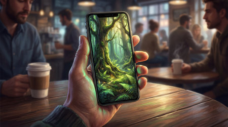 A hand holds a smartphone displaying a train on tracks with city lights and schedule information...