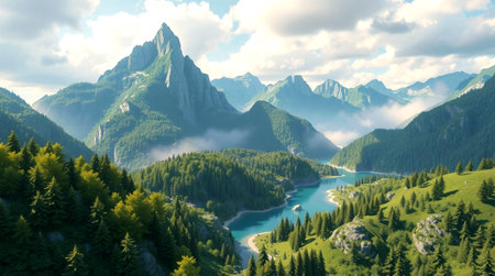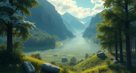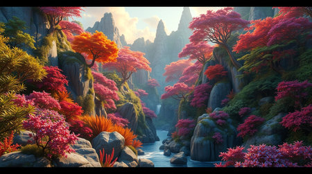 3D render of a beautiful fantasy landscape with colorful trees and a river