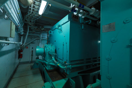Cruise ship engine room interior with water tight doors electrical and diesel engines, water pipes, measuring instruments, diesel engines