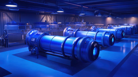 A captivating view of a futuristic industrial facility showcasing advanced technology. The blue lighting enhances the sleek design of sophisticated machinery and equipment.