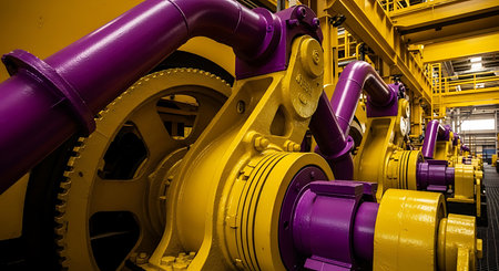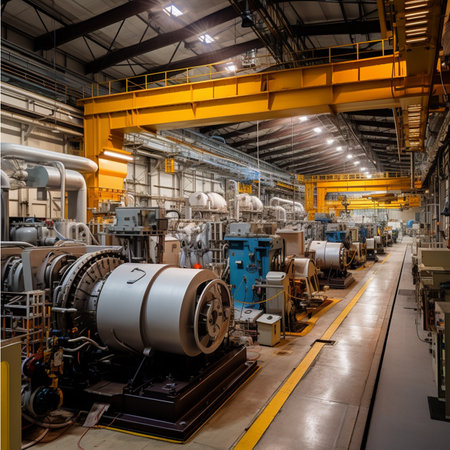 A vibrant depiction of industrial machinery within a factory, highlighting large turbines and advanced equipment, focusing on technology and manufacturing processes.