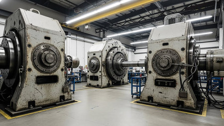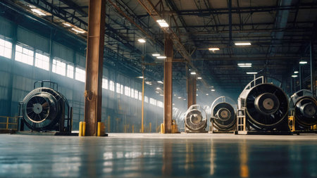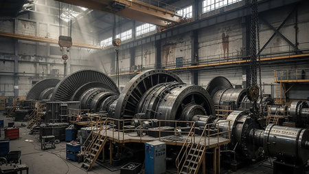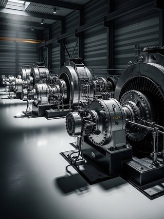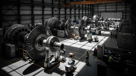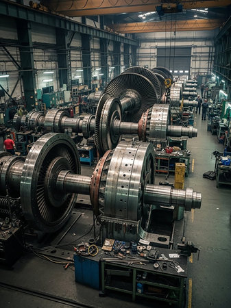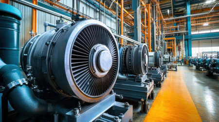 High-tech industrial turbines showcased within a modern factory, featuring intricate machinery, bright lighting, and a well-organized layout for engineering processes.