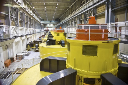 Large industrial turbines and generators inside a modern hydroelectric power plant
