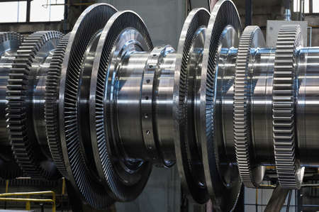 New rotor of powerful steam turbine in plant workshop