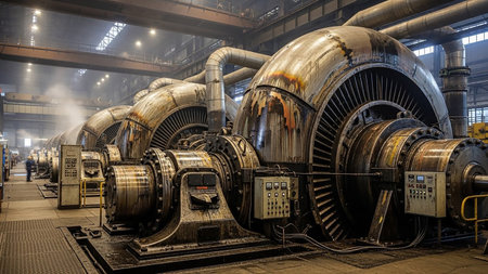 Industrial power plant interior with turbines, control panels, and monitoring devices