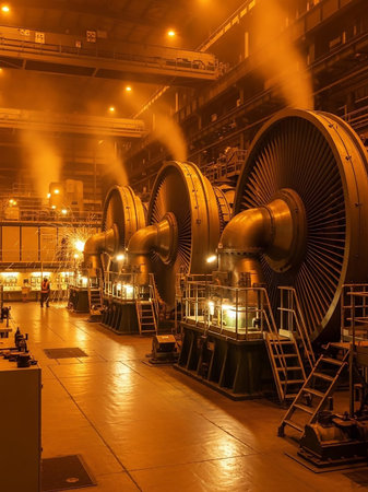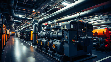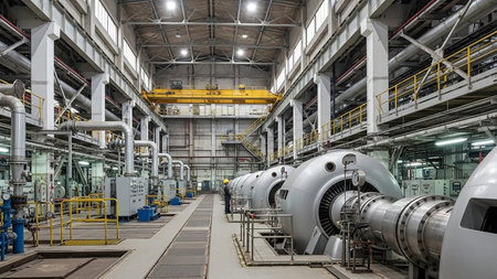 Industrial interior of a power plant with large steel pipes and machinery
