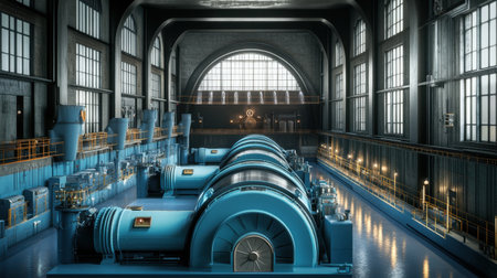 A detailed view of an industrial power plant interior showcasing advanced turbines and machinery under large historical windows. Highlighting technology and design.