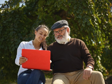 Help someone you love. Portrait of young smiling girl sitting with grandfather and laptop against city park. community and family lifestyle concept