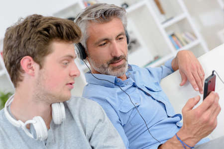 Father and son listening to music on headphones