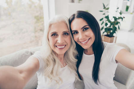 Self-portrait of two nice attractive lovely sweet cute charming cheerful cheery women spending free time day weekend life good mood care in white light interior house flat apartment