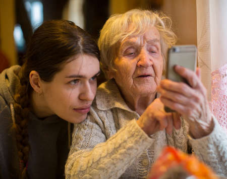 An elderly woman looks at a smartphone, with his adult granddaughter.