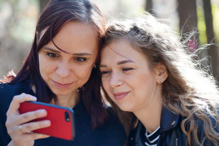 Close up of young women browsing mobile phone in wood. Pretty females gossip, looking in smartphone. Concept of meeting of girlfriends.