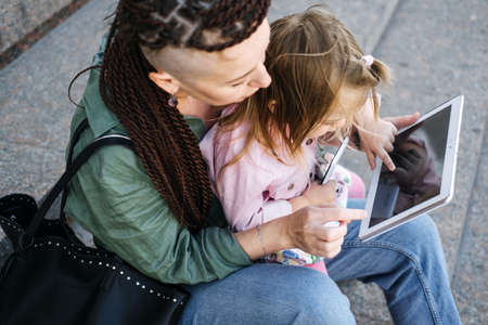 Freelance Parents. Busy working mom with baby toddler daughter on hands walk and looking on tablet in street. Multitasking Freelancer mom making notes while holding her baby outddors.