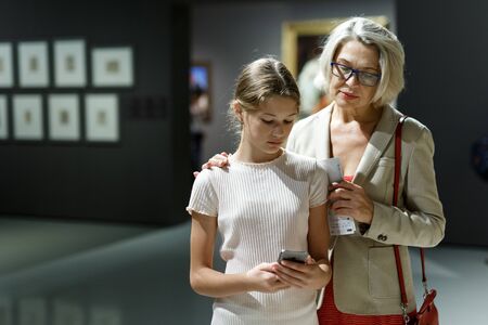 Teenage girl using phone while visiting museum with mature woman