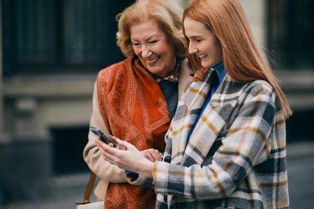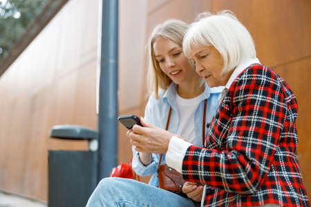 Happy elderly woman spending time with young lady outdoors
