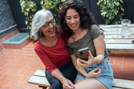 Portrait Of Mature Mother With Her Daughter Using Cellphone