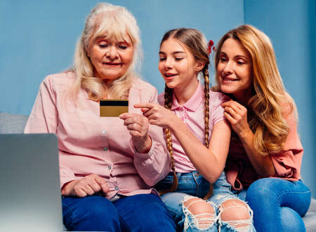 Grandmother, daughter and grandchild together at home, happy domestic life moments - Family shopping online at computer laptop, concepts about elderly, mult-generation family and relationship