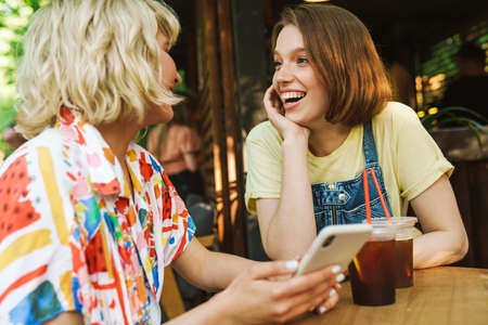 Image of cheerful young two women laughing and using cellphone while sitting at table in street cafe outdoors